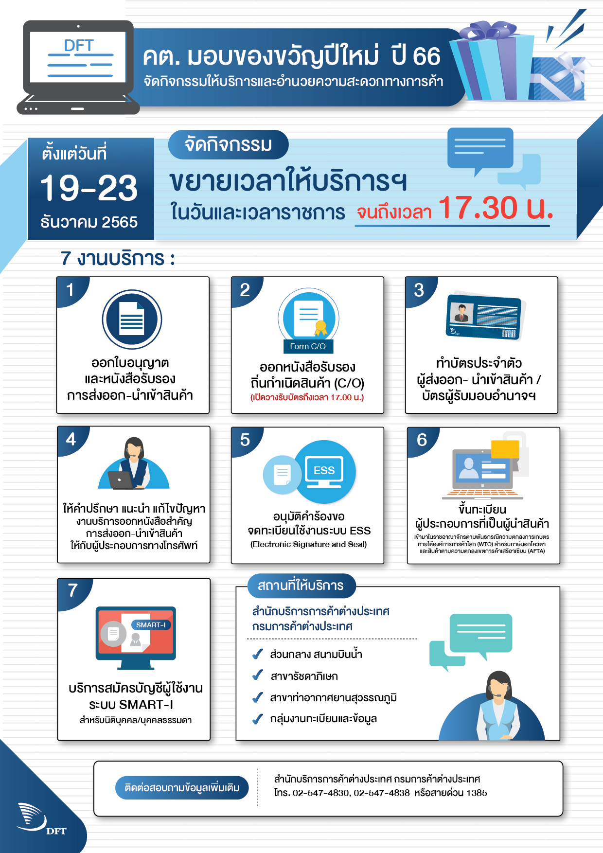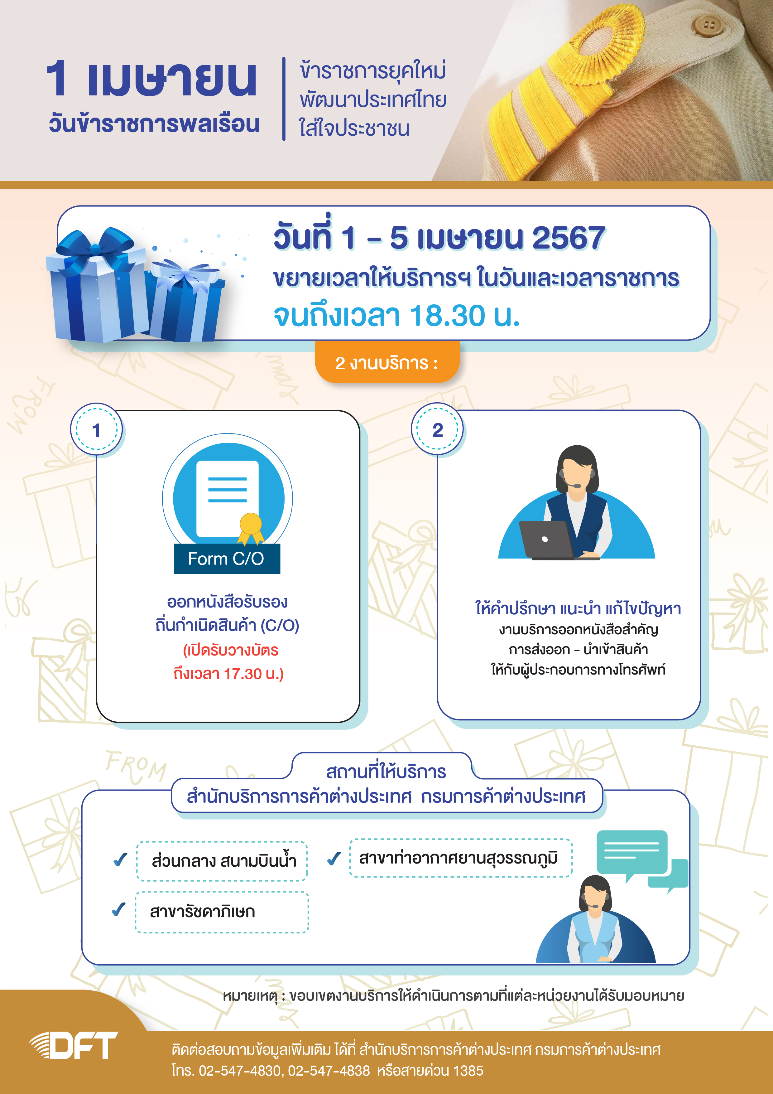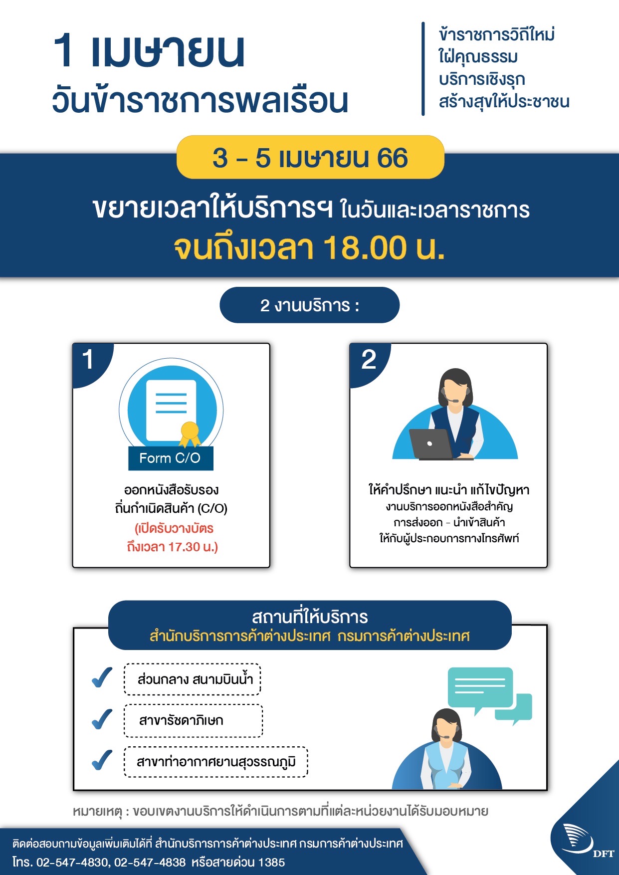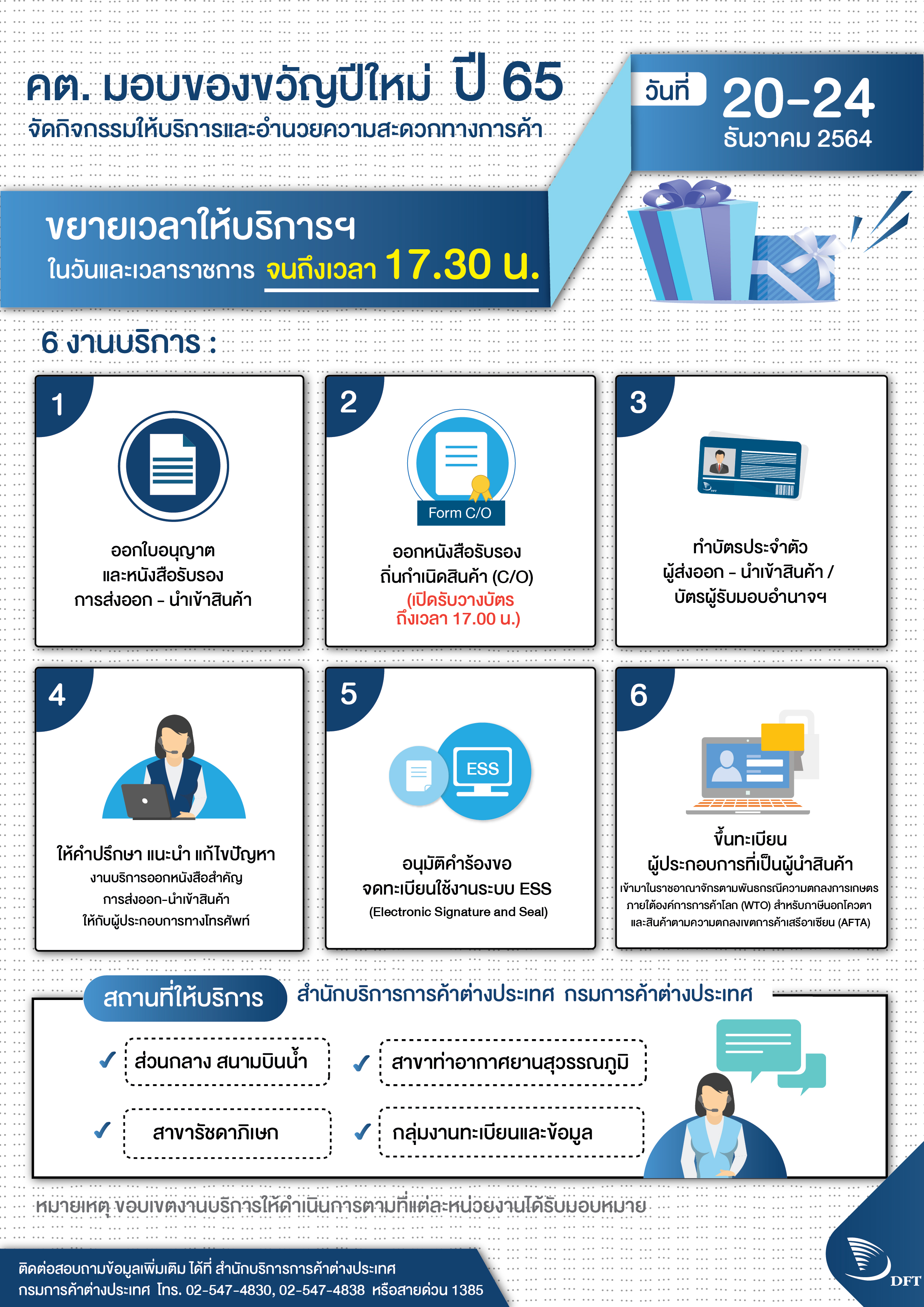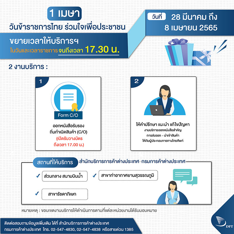 1. ปิด การให้บริการของสำนักบริการการค้าต่างประเทศ ส่วนกลาง (สนามบินน้ำ) สาขาสุวรรณภูมิและรัชดาภิเษก ในวันจันทร์ที่ 5 พฤษภาคม 2568 เนื่องจากเป็นวันหยุดชดเชยวันฉัตรมงคล ทั้งนี้ จะขยายเวลาการวางบัตรเพื่อขอรับงาน ณ หน่วยงานให้บริการดังกล่าวในวันศุกร์ที่ 2 พฤษภาคม 2568 จนถึงเวลา 17.00 น.