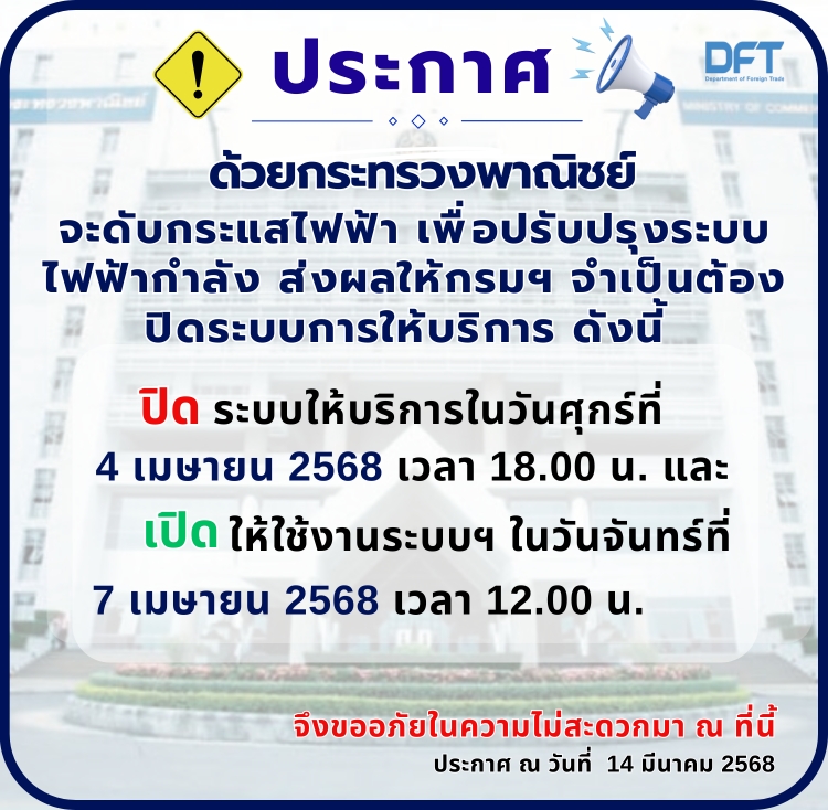 กรมฯ จะทำการปิดระบบการให้บริการออกหนังสือรับรองถิ่นกำเนิดสินค้า ดังนี้