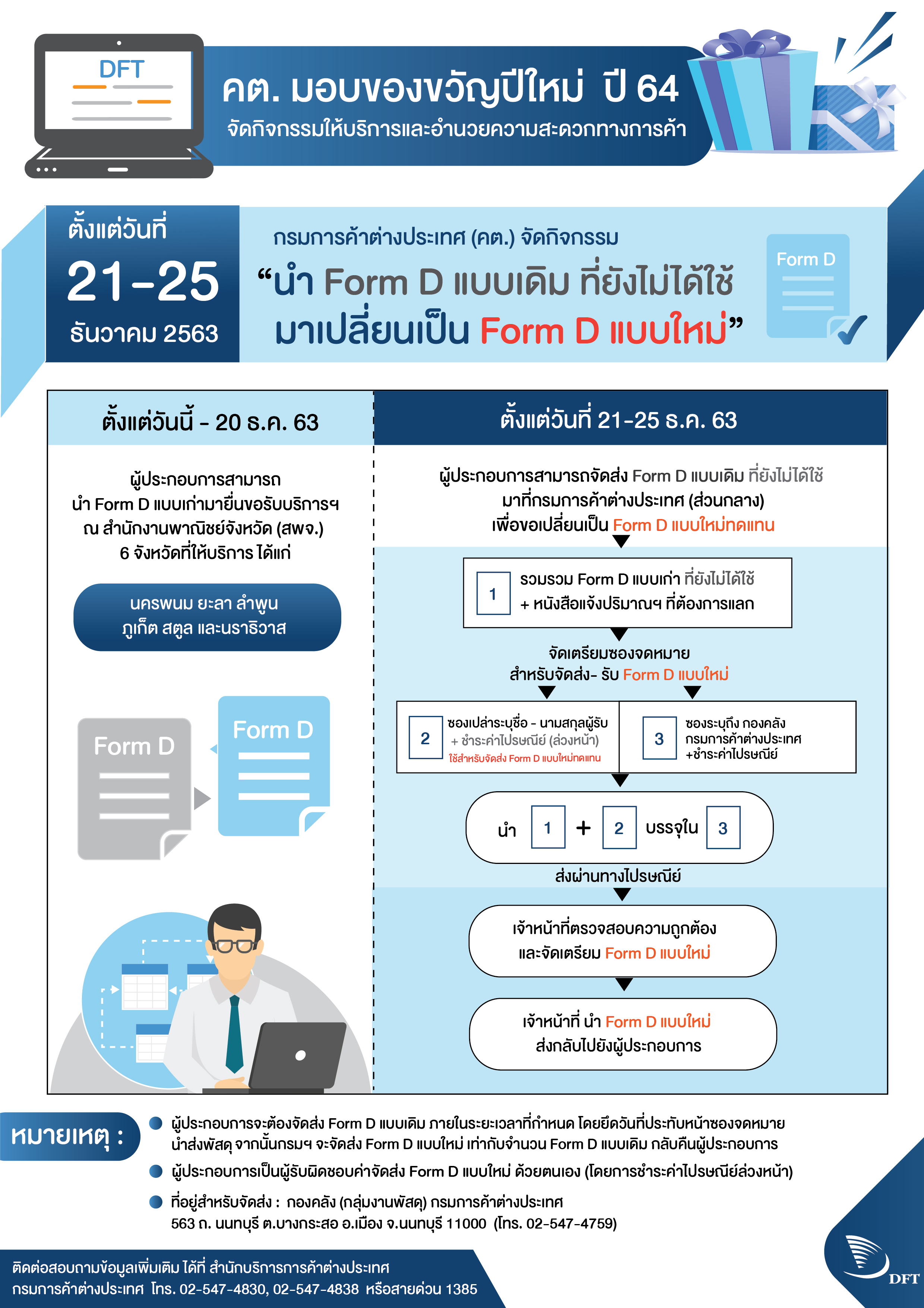 ทั้งนี้ ผู้ส่งออกที่ขอ Form D ผ่านระบบของกรมฯ หรือสำนักงานพาณิชย์จังหวัด 8 จังหวัด (เชียงใหม่ เชียงราย ตาก มุกดาหาร หนองคาย สระแก้ว ชลบุรี และสงขลา) ไปยัง 4 ประเทศข้างต้น จะไม่ได้รับผลกระทบใดๆ เพราะระบบของกรมฯ จะส่งข้อมูลอิเล็กทรอนิกส์ของ Form D ไปยังศุลกากรประเทศปลายทางภายใต้ ASEAN Single Window : ASW